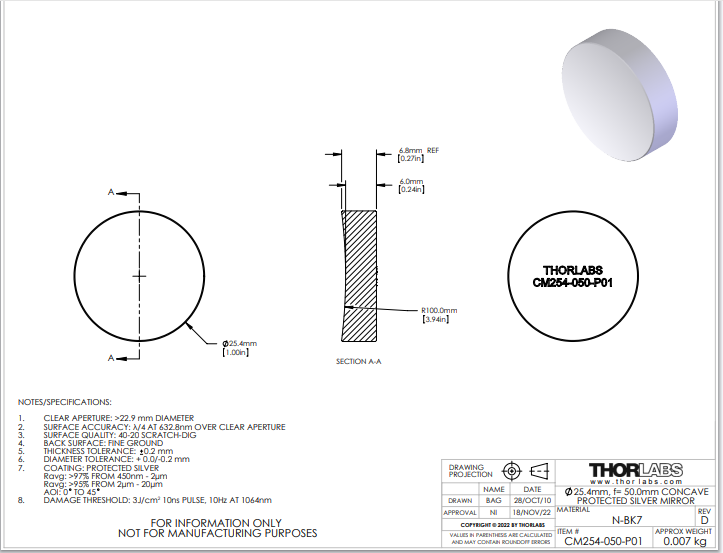 Thorlabs索雷博       CM254-050-P01   镀银凹面反射镜