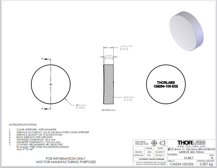 Thorlabs索雷博 CM254-100-E02 介质膜凹面反射镜