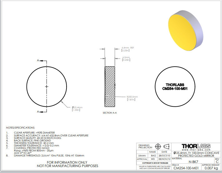 Thorlabs索雷博 CM254-100-M01 镀金凹面镜