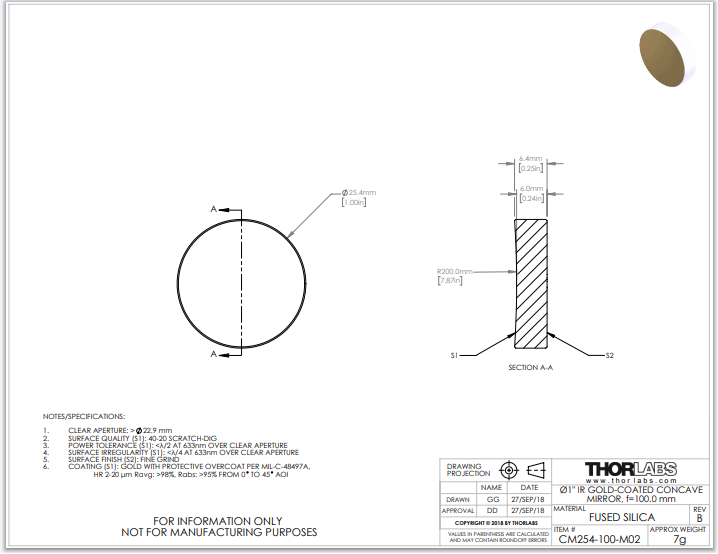 Thorlabs索雷博 CM254-100-M02 Herriott气体池反射镜