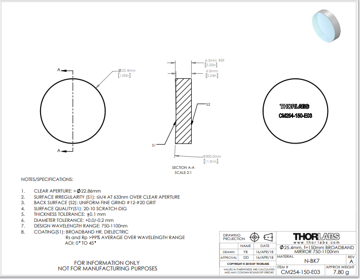 Thorlabs索雷博 CM254-150-E03 Ø1英寸介质膜凹面反射镜