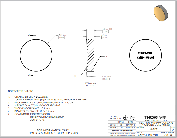 Thorlabs索雷博 CM254-150-M01 镀金凹面镜