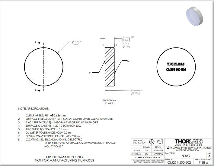 Thorlabs索雷博 CM254-500-E02 介质膜凹面反射镜