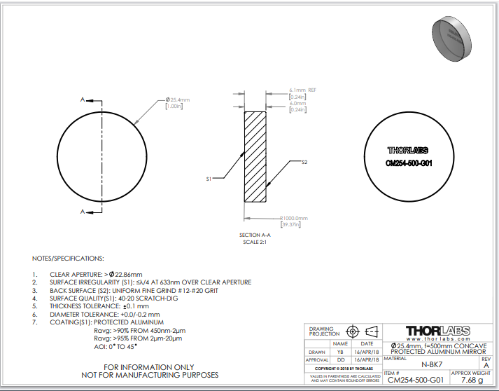 Thorlabs索雷博 CM254-500-G01 镀铝凹面镜