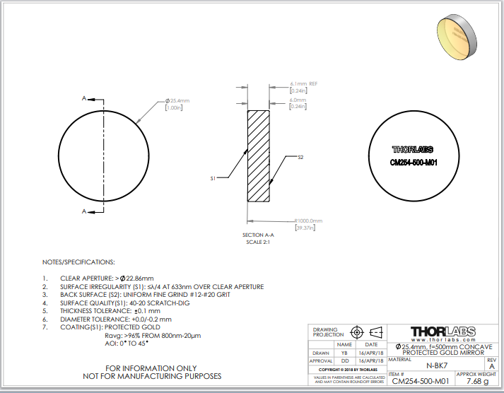 Thorlabs索雷博 CM254-500-M01 镀金凹面镜