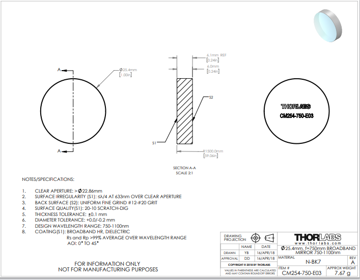 Thorlabs索雷博 CM254-750-E03 Ø1英寸介质膜凹面反射镜