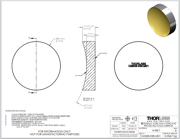 Thorlabs索雷博 CM508-038-M01 镀金凹面镜