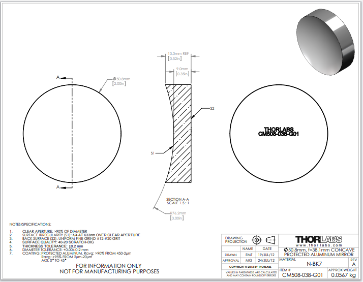 Thorlabs索雷博       CM508-038-G01   镀铝凹面镜