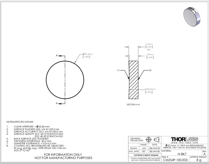 Thorlabs索雷博       CM254P-100-E03   介质膜凹面镜
