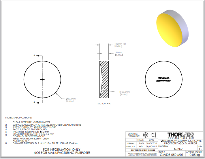Thorlabs索雷博 CM508-050-M01 镀金凹面镜