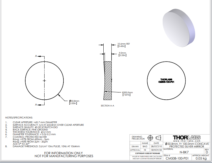 Thorlabs索雷博 CM508-100-P01 镀银凹面反射镜