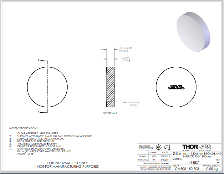 Thorlabs索雷博       CM508-150-E03   Ø2英寸介质膜凹面反射镜