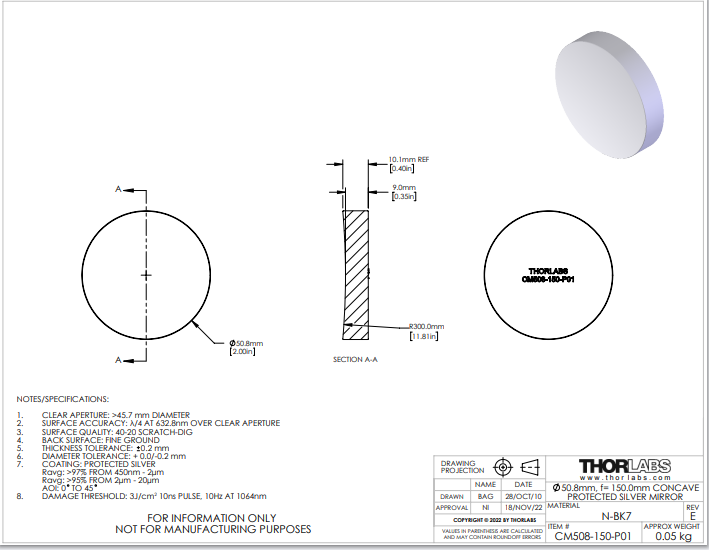 Thorlabs索雷博 CM508-150-P01 镀银凹面反射镜