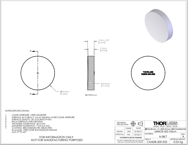 Thorlabs索雷博 CM508-200-E02 介质膜凹面反射镜