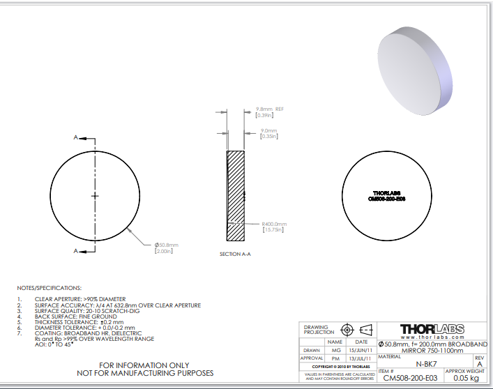 Thorlabs索雷博 CM508-200-E03 Ø2英寸介质膜凹面反射镜