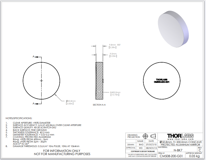 Thorlabs索雷博 CM508-200-G01 镀铝凹面镜