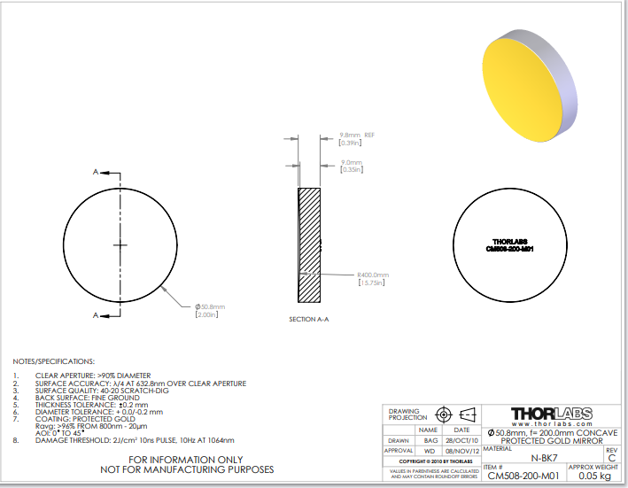 Thorlabs索雷博 CM508-200-M01 镀金凹面镜