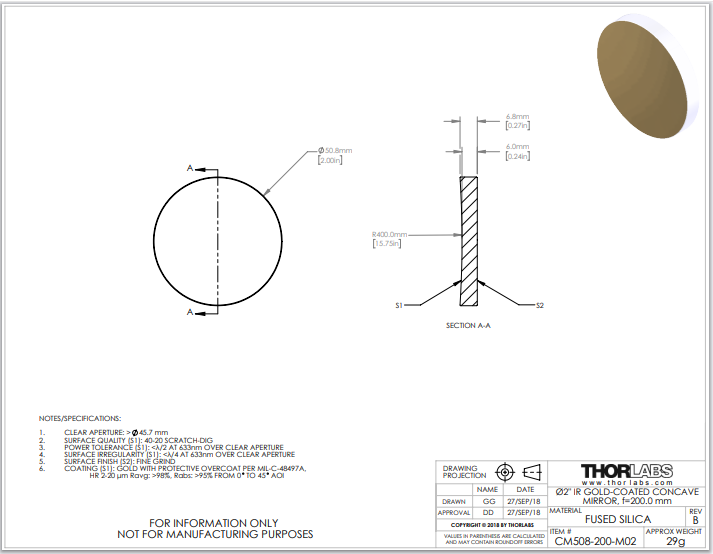 Thorlabs索雷博       CM508-200-M02   Herriott气体池反射镜