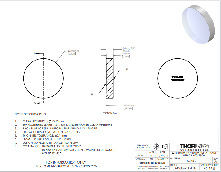 Thorlabs索雷博       CM508-750-E02   介质膜凹面反射镜