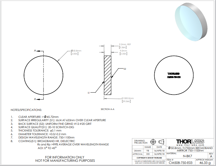 Thorlabs索雷博 CM508-750-E03 Ø2英寸介质膜凹面反射镜