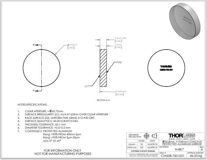 Thorlabs索雷博 CM508-750-G01 镀铝凹面镜