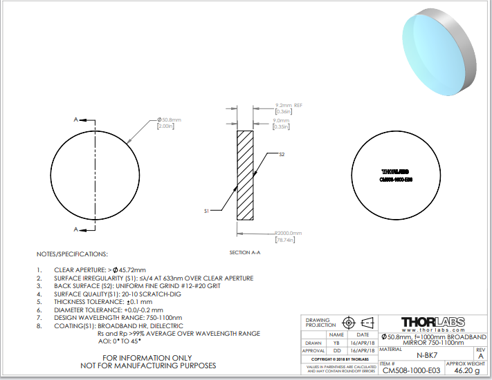 Thorlabs索雷博 CM508-1000-E03 Ø2英寸介质膜凹面反射镜