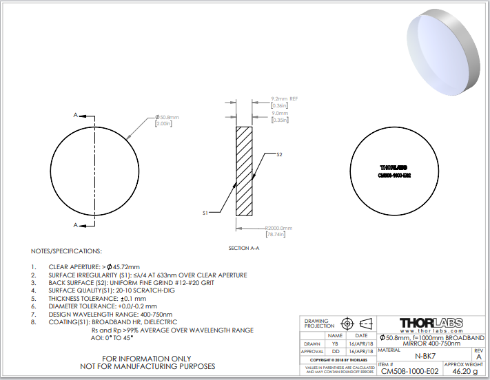Thorlabs索雷博       CM508-1000-E02   介质膜凹面反射镜