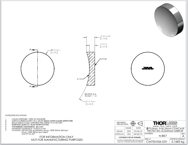 Thorlabs索雷博 CM750-056-G01 镀铝凹面镜