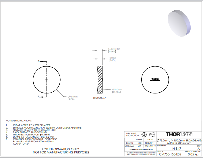 Thorlabs索雷博       CM750-150-E02   Ø75毫米介质膜凹面反射镜