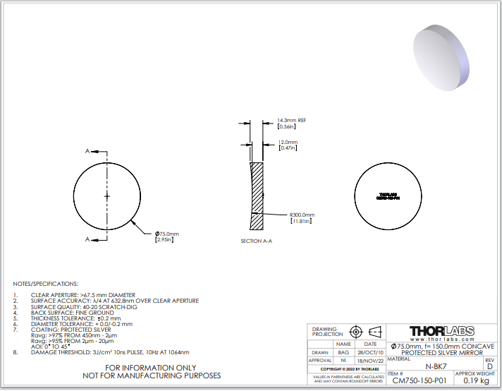 Thorlabs索雷博 CM750-150-P01 镀银凹面反射镜