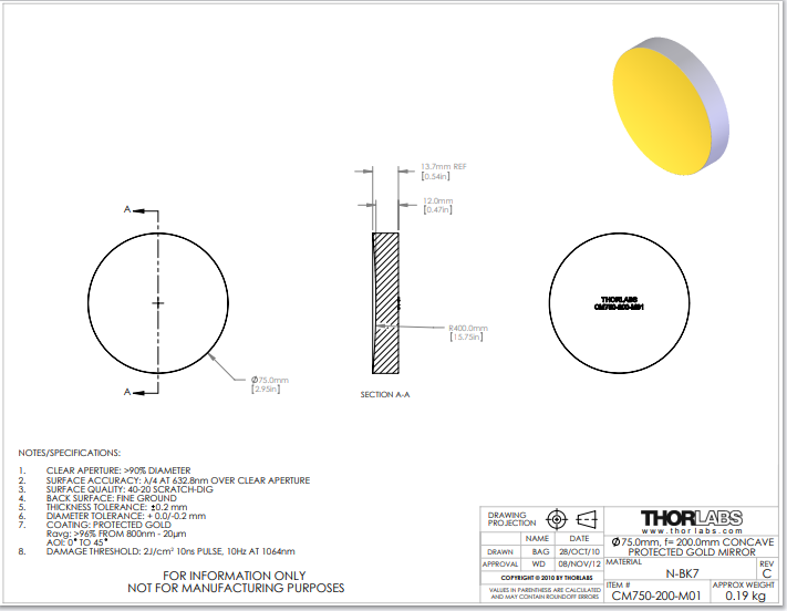 Thorlabs索雷博 CM750-200-M01 镀金凹面镜