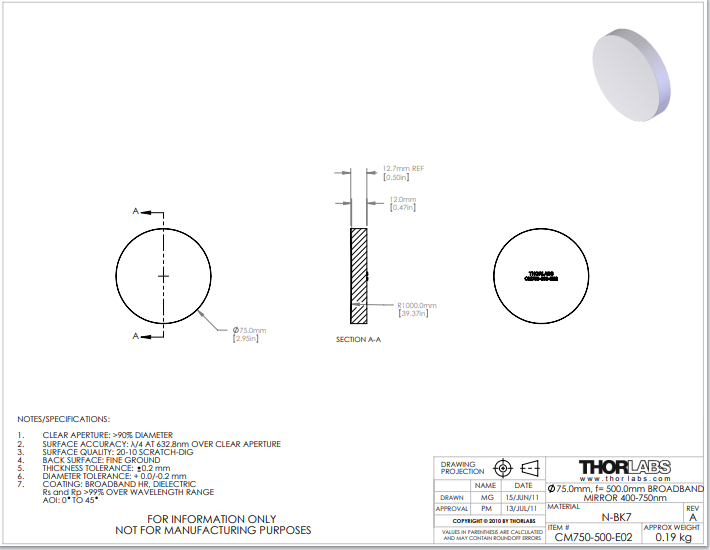 Thorlabs索雷博 CM750-500-E02 Ø75毫米介质膜凹面反射镜