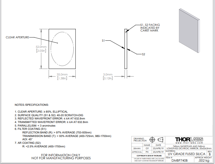 Thorlabs索雷博 DMBP740B 多波段二向色镜