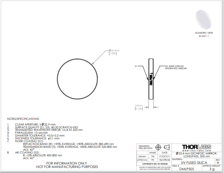 Thorlabs索雷博 DMLP505 长波通二向色镜