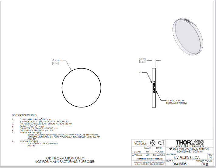 Thorlabs索雷博 DMLP505L 长波通二向色镜
