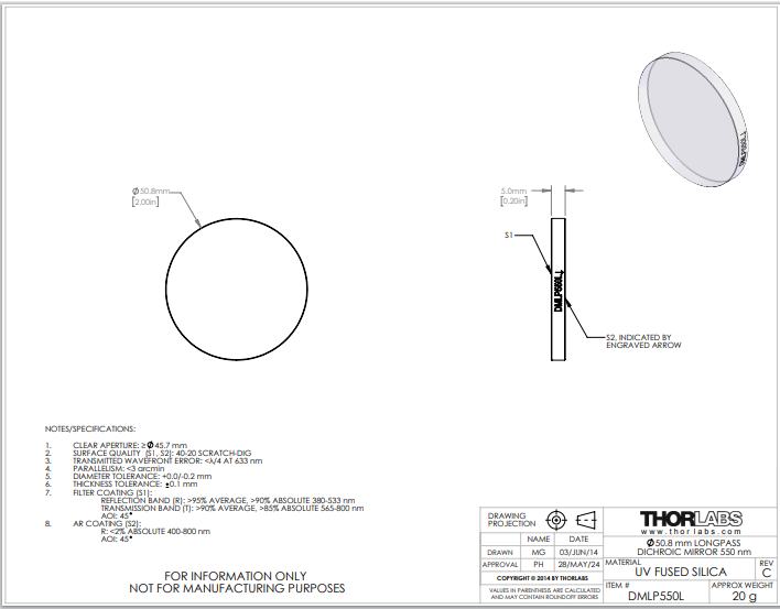 Thorlabs索雷博 DMLP550L 长波通二向色镜