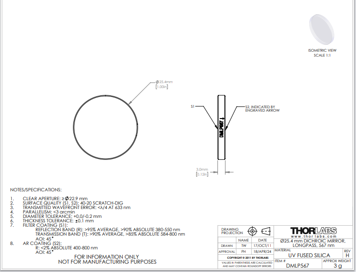 Thorlabs索雷博 DMLP567 长波通二向色镜