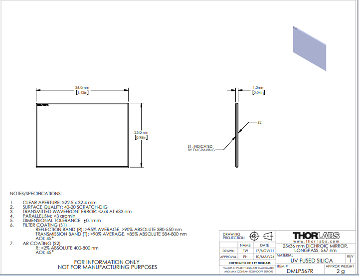 Thorlabs索雷博 DMLP567R 长波通二向色镜