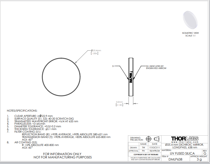 Thorlabs索雷博 DMLP638 长波通二向色镜