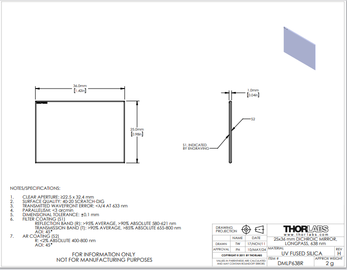 Thorlabs索雷博 DMLP638R 长波通二向色镜