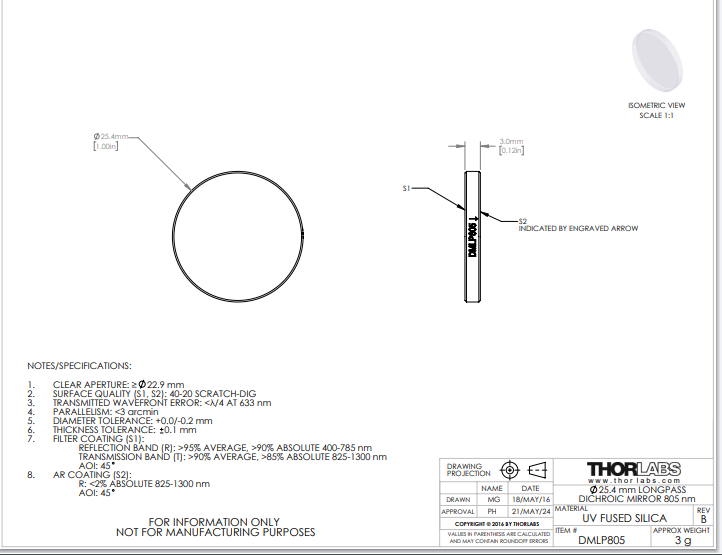 Thorlabs索雷博 DMLP805 长波通二向色镜