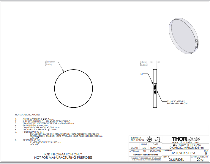 Thorlabs索雷博 DMLP805L 长波通二向色镜