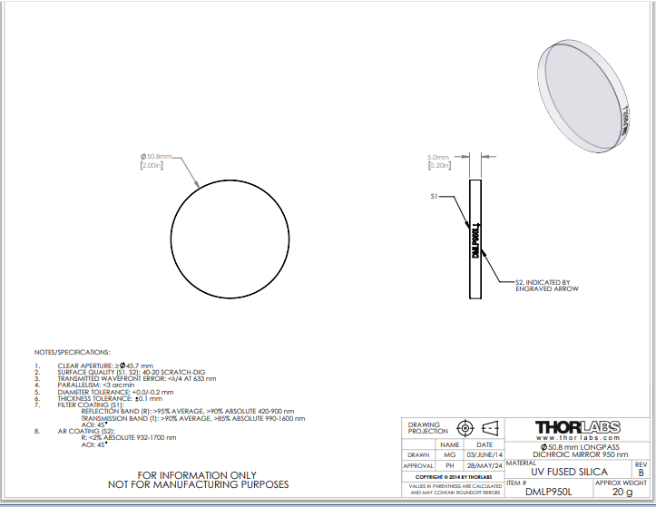 Thorlabs索雷博 DMLP950L 长波通二向色镜
