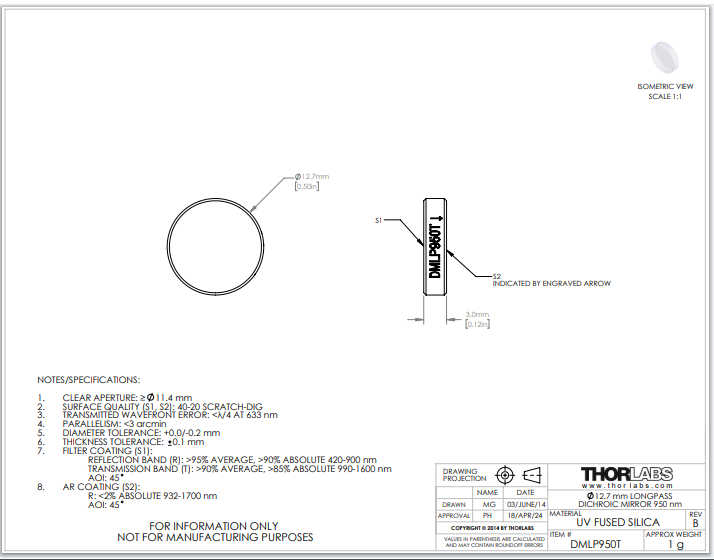 Thorlabs索雷博 DMLP950T 长波通二向色镜