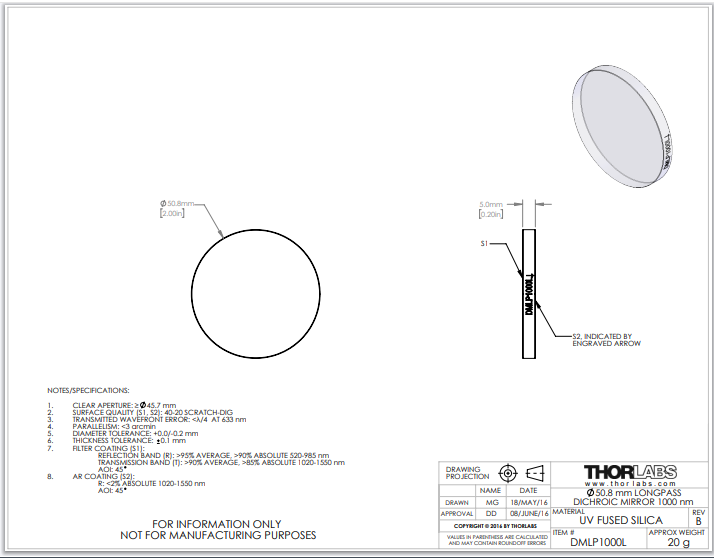 Thorlabs索雷博 DMLP1000L 长波通二向色镜