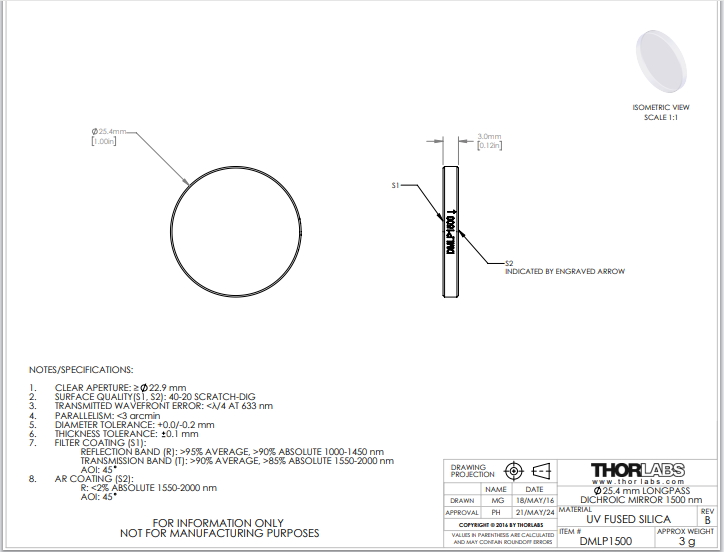 Thorlabs索雷博 DMLP1500 长波通二向色镜