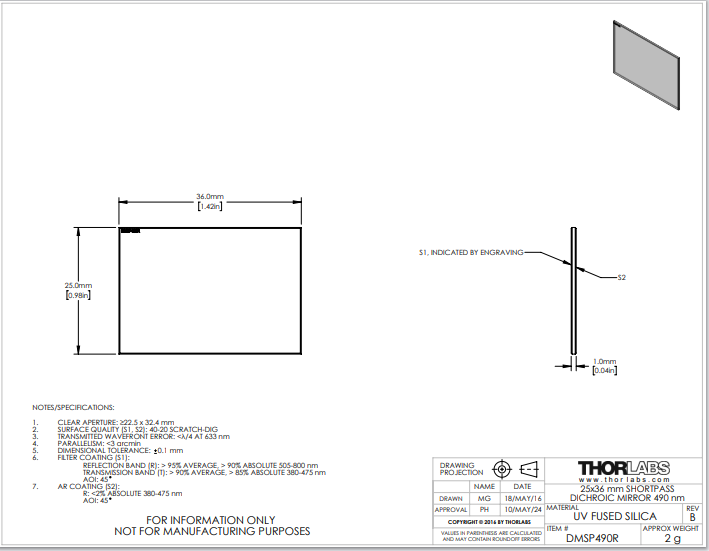 Thorlabs索雷博       DMSP490R   短波通二向色镜