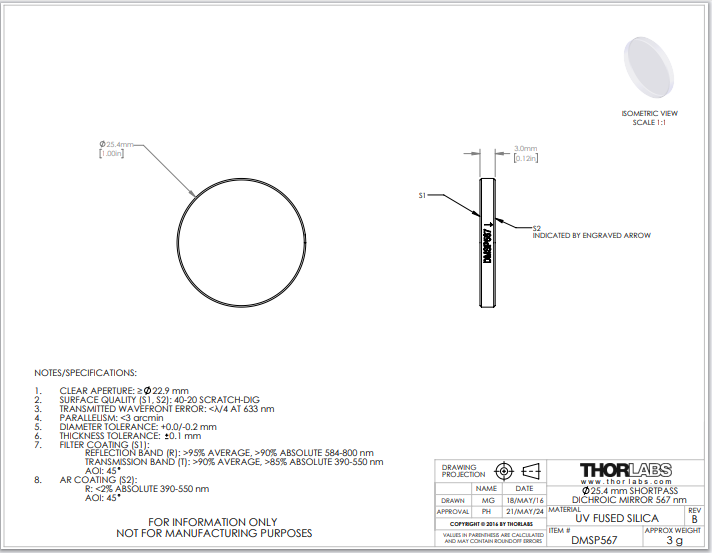 Thorlabs索雷博       DMSP567   短波通二向色镜