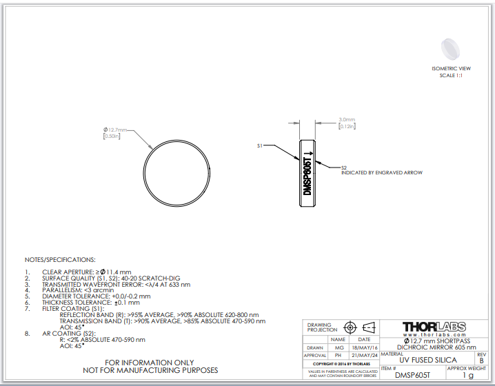 Thorlabs索雷博       DMSP605T   短波通二向色镜