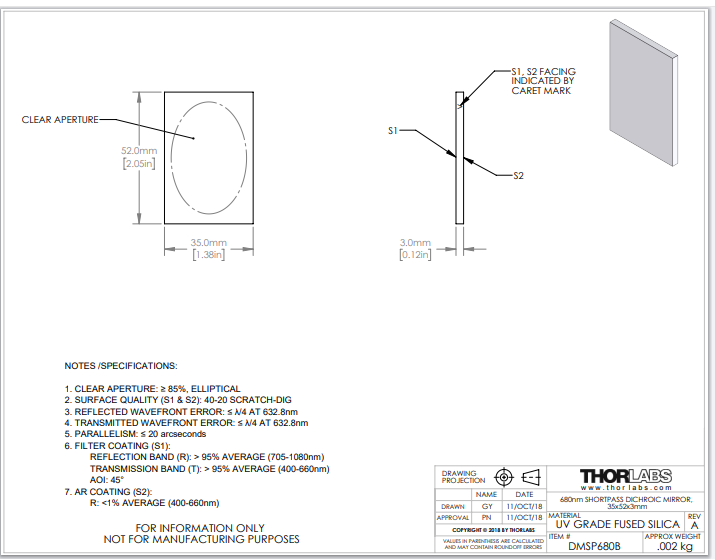 Thorlabs索雷博       DMSP680B   短波通二向色镜
